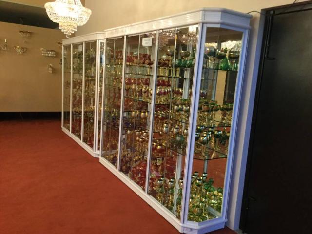 Vitrina em alumínio lacado em branco com friso de madeira, com prateleiras em vidro com 8mm, polidas, com espelho no fundo e costas com grelha acrílica e luz fluorescente integrada, com portas de abrir com puxadores e fechos de segurança.
